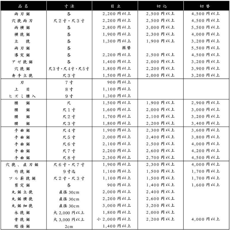 各種高級刃物・大工道具・鋸目立お任せください。 お仕事から家庭で役立つ刃物・道具を豊富に取り揃えています。長年使い込んだ、大切な刃物を熟練の技で蘇らせます。 鋸目立価格表 PRICE 要予約 渡部鋸店について ABOUT 店舗名 渡部鋸店 住所 〒790-0822 愛媛県松山市高砂町1丁目6−5 電話番号 089-925-2521 営業時間 10:00〜18:00 定休日 不定休 アクセス 清水町駅出口から徒歩約4分本町四丁目駅出口から徒歩約4分 アクセス ACCESS